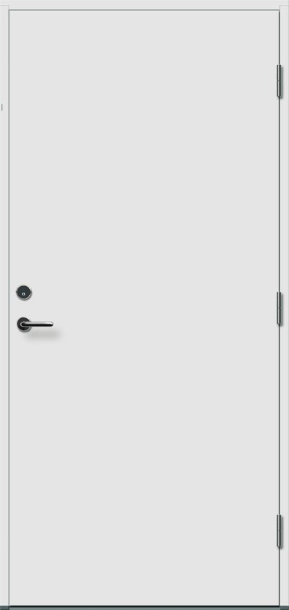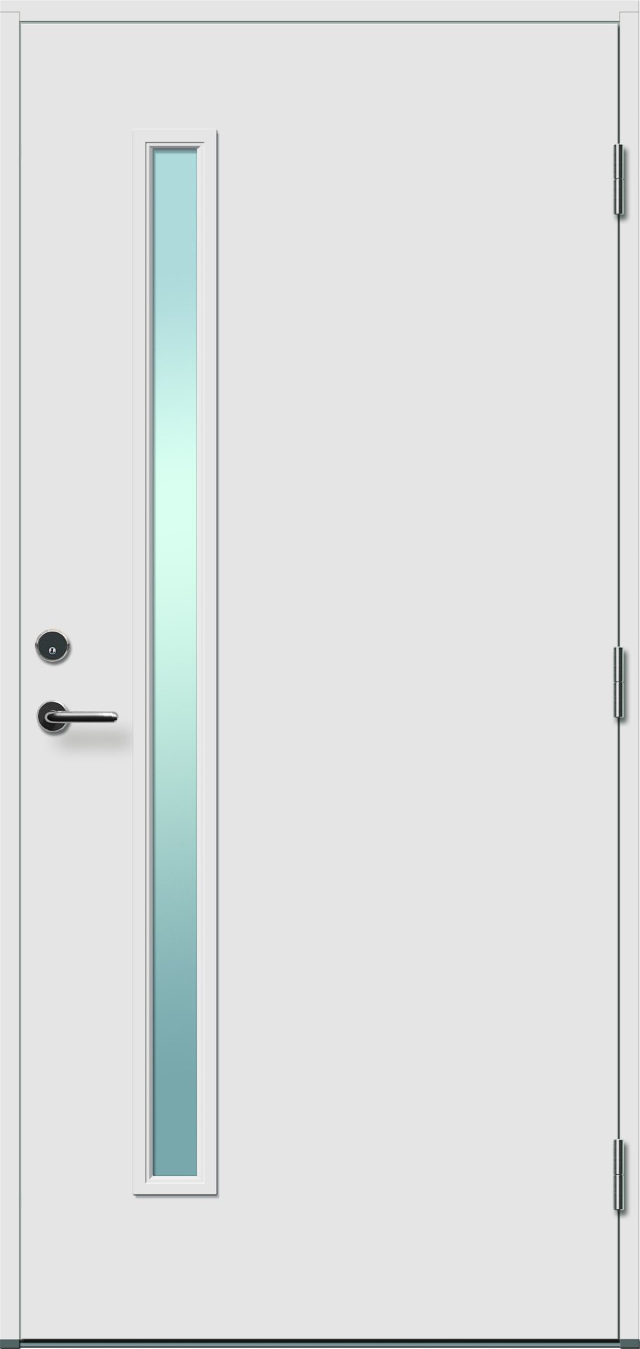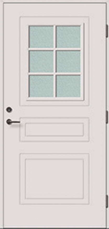 En ytterdörr av standardkaraktär med litet ljusinsläpp, slät utsida och slät insida med klarglas.